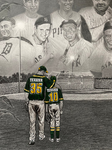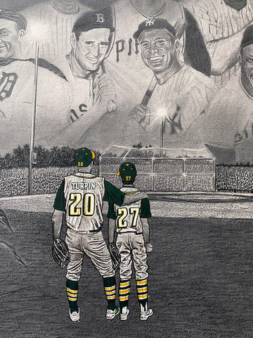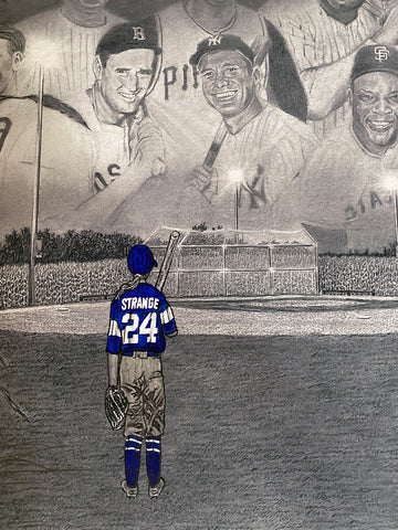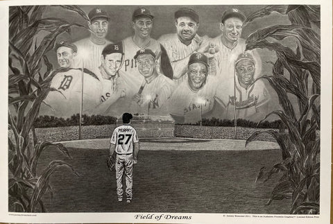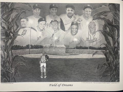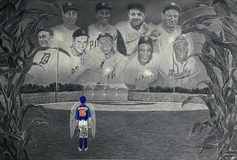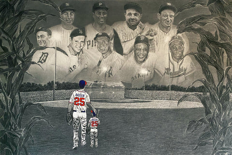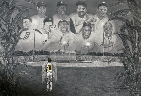 This drawing captures the dream of every young baseball player to one day play in the Majors and combines this feeling with a surreal, magical field hidden in a vast cornfield. Appearing to the boy in his dream are 9 of the most legendary players to ever play baseball: Joe Dimaggio, Roberto Clemente, Babe Ruth, Lou Gehrig, Ty Cobb, Ted Williams, Mickey Mantle, Willie Mays and Hank Aaron.